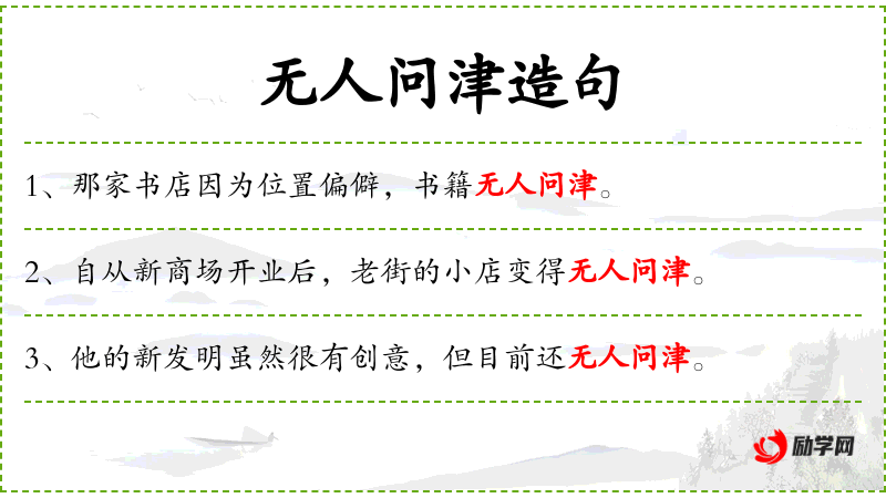 1. 【无人问津】 问津:询问渡口。比喻没有人来探问、尝试或购买。