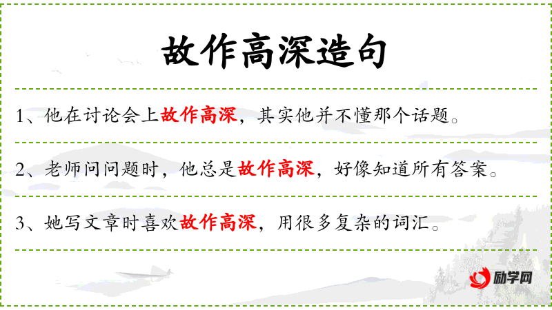 - 故作高深:装腔作势、故弄玄虚