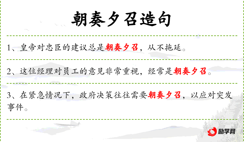 1. 【朝奏夕召】 - 指早晨上书帝王,晚上就被召见。形容被朝廷任用之速。