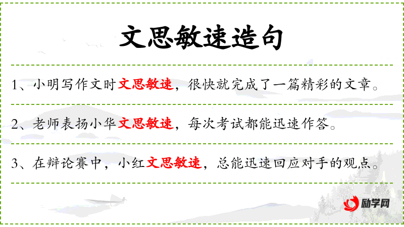 - 文思敏速:形容词短语,形容思维敏捷,写作速度快。
