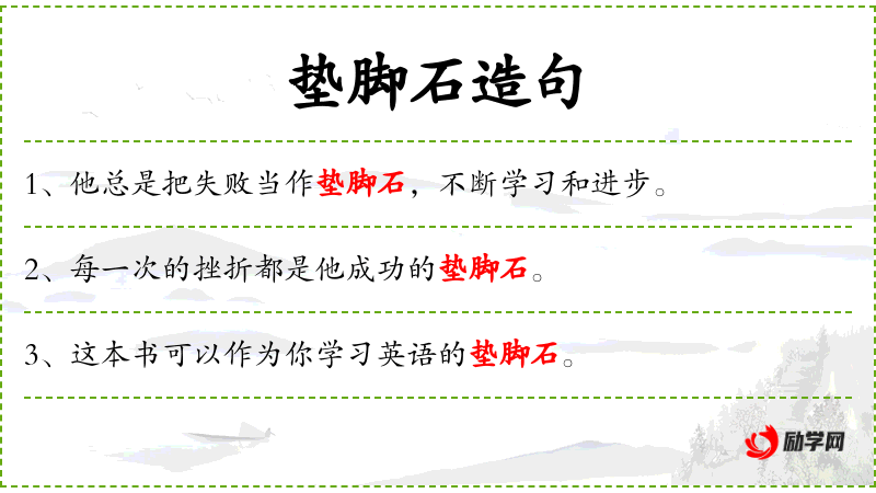 - 垫脚石:比喻为达到某个目的而借助的基础或手段。