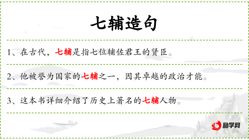 1. 【七辅】 - 传说辅助黄帝的七个人风后﹑天老﹑五圣﹑知命﹑窥纪﹑地典﹑力墨(亦作力牧)。见旧题晋陶潜《集圣贤群辅录》上。