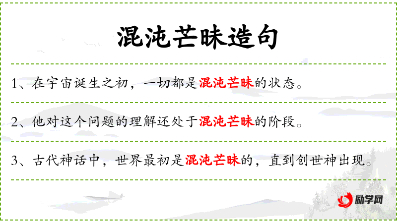 6. 【混沌芒昧】 混沌:古人想像中的天地形成以前的状态。指上古时期人类尚未开化的状态。也形容人无知无识的样子。