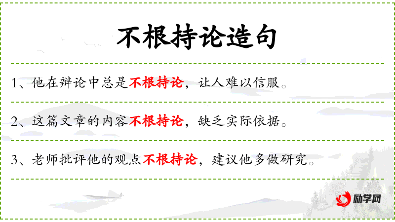 1. 【不根持论】 根:根据;持论:提出自己的论点或主张。指毫无根据地提出个人的论点或主张。