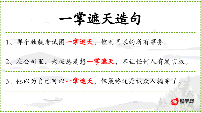 - 一掌遮天:这是一个成语,比喻某人试图控制或主导一切,通常带有贬义。