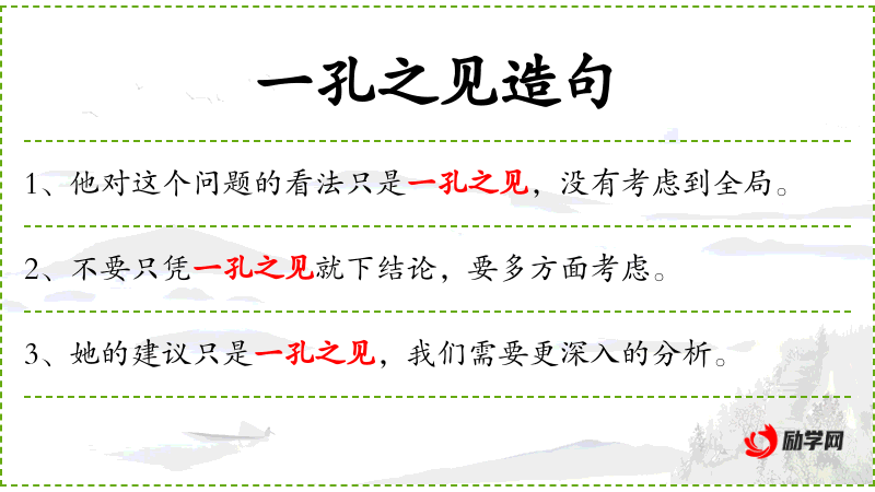 “一孔之见”是一个成语,源自古代的哲学思想,强调不要局限于狭隘的观点或视野。这句话体现了文化中对于全面和深入思考的重视。