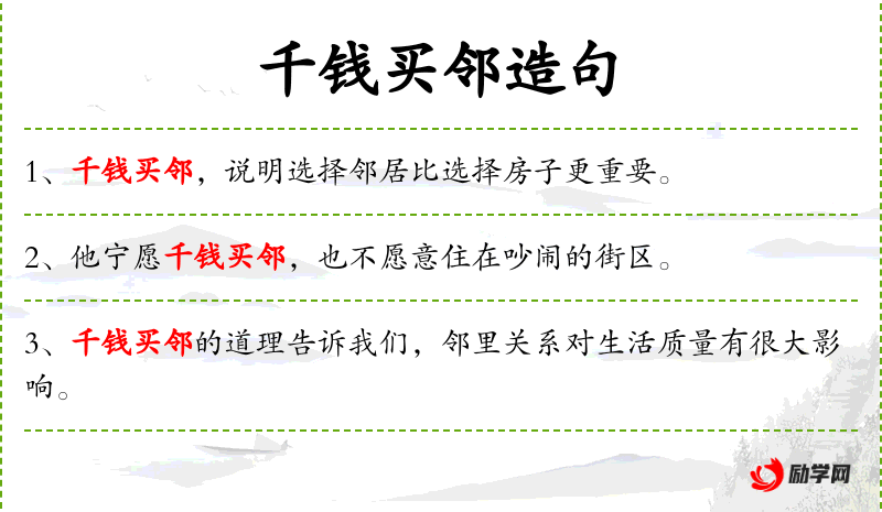 - 千钱买邻:比喻为了好的邻居愿意付出很大的代价。