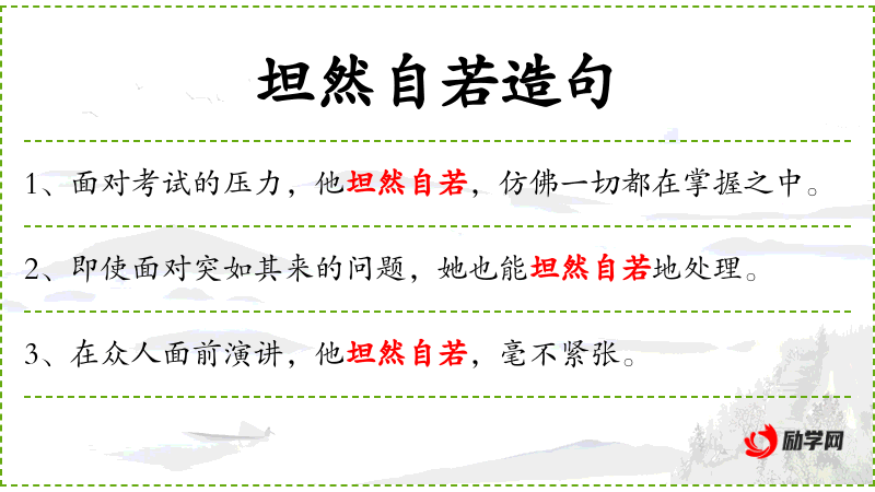 - 坦然自若:形容人在紧张或困难的情况下保持冷静、不慌不忙。