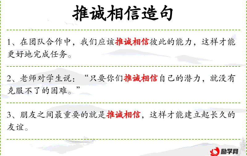 句子:“朋友之间最重要的就是推诚相信,这样才能建立起长久的友谊。”
