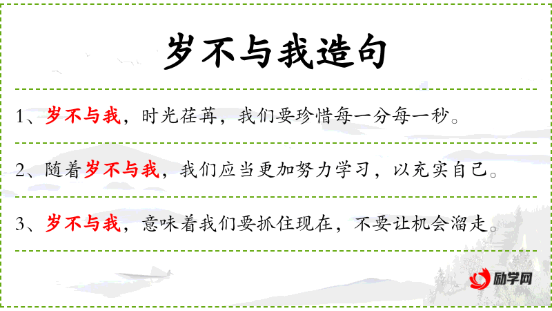 - 宾语:句子中没有明确的宾语,但“告诉我们时间不等人”这部分可以看作是宾语从句,解释了“岁不与我”的具体含义。