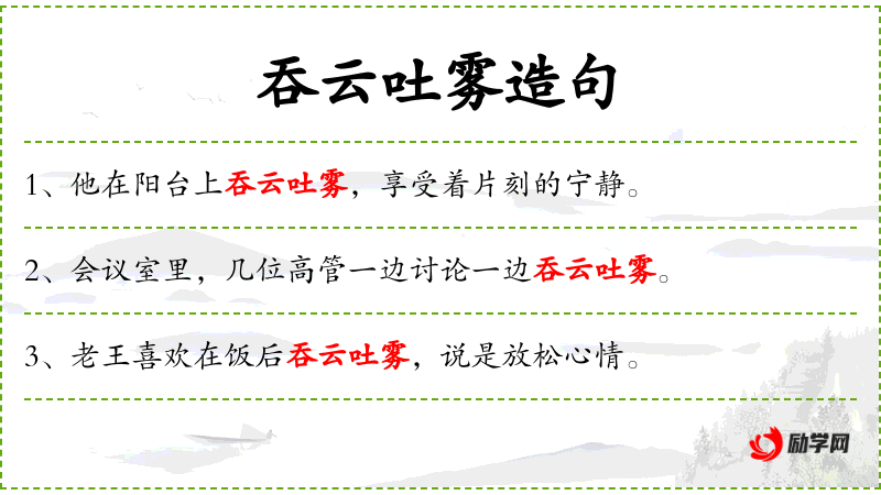 - 吞云吐雾:吸烟、抽烟