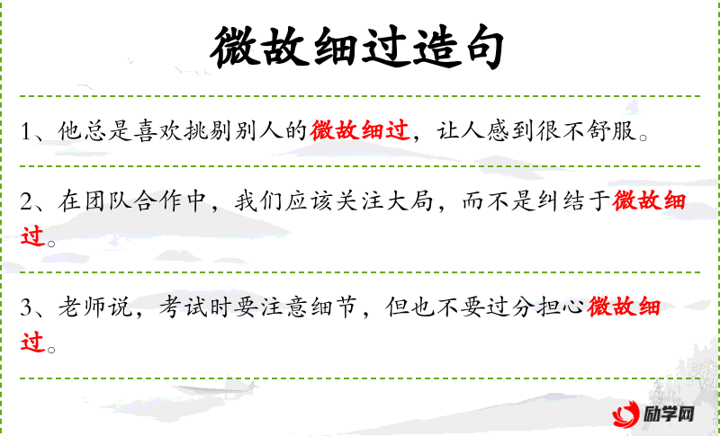 - 微故细过:名词短语,指微小的错误或缺点。