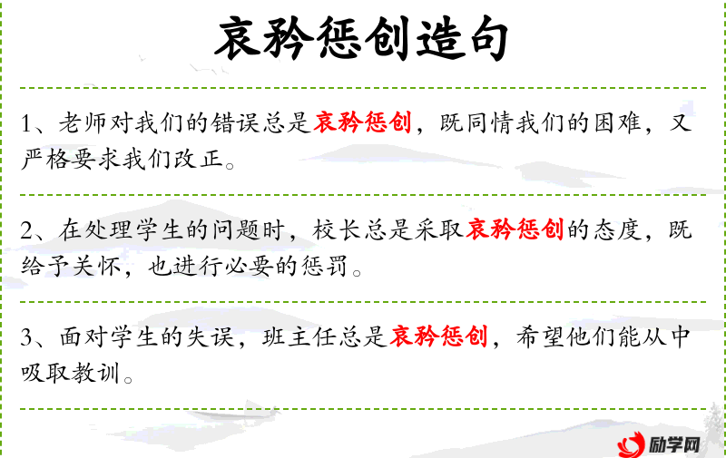 - 哀矜惩创:这个词组可能不太常见,它结合了“哀矜”(同情、怜悯)和“惩创”(惩罚、纠正)的意思,表示在教育中既要有同情心,也要有适当的惩罚和纠正。
