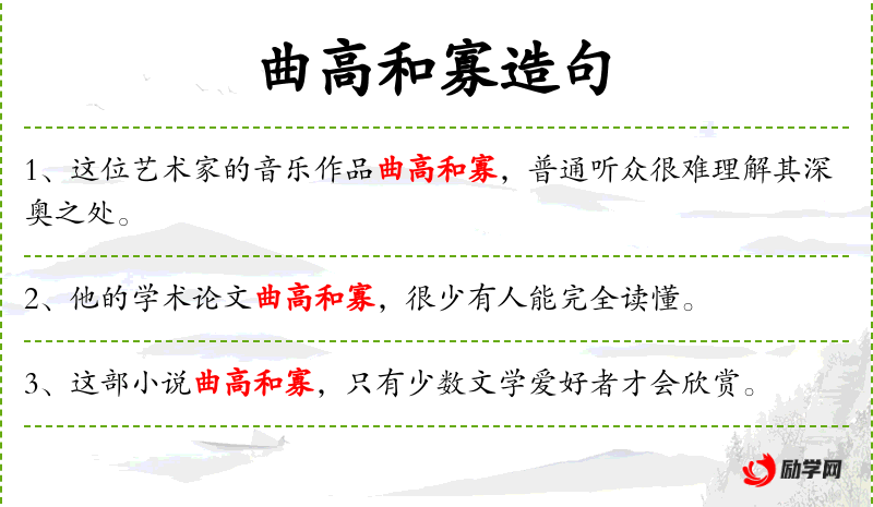 2. 【曲高和寡】 - 曲调高深,能跟着唱的人就少。旧指知音难得。现比喻言论或作品不通俗,能了解的人很少。