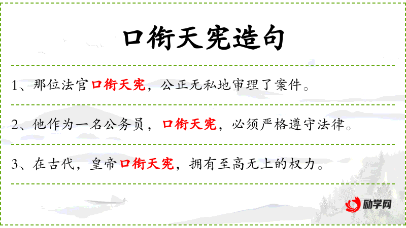 - 口衔天宪:成语,意指说话或行动具有极高的权威性,如同天命一般。