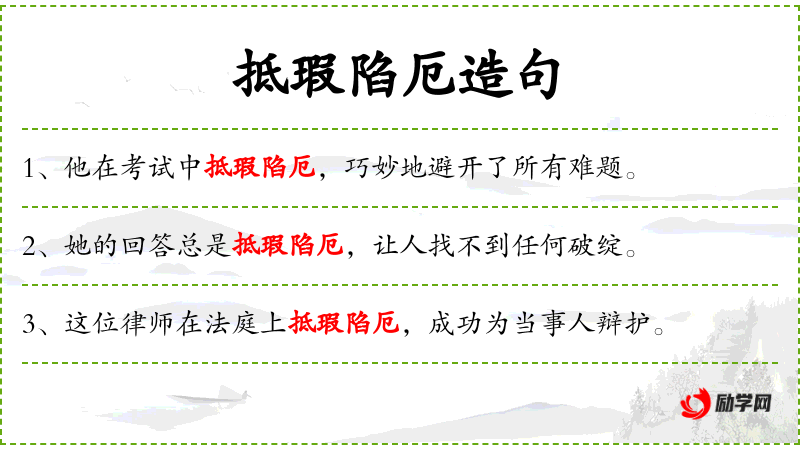 - 抵瑕陷厄:成语,意思是巧妙地避开错误和困难,使文章更加完美。