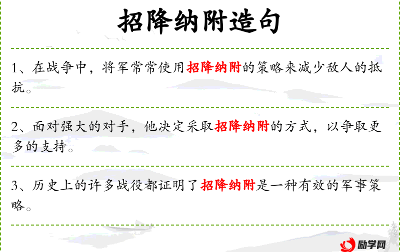 - 招降纳附:指通过招揽、接纳和归附的方式,将反对者或敌对势力转化为自己的支持者。