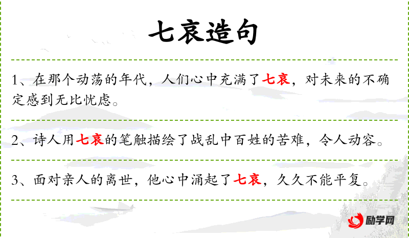 魏晋乐府的一种诗题。起于汉末『王粲﹑三国魏曹植﹑晋张载皆有《七哀诗》,为反映社会动乱,抒发悲伤感情的五言诗; 泛指多种哀伤。