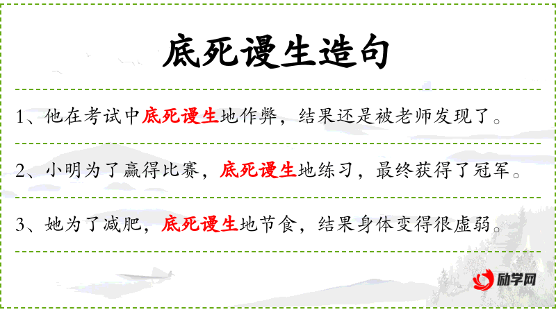 - 成语“底死谩生”反映了中文中对极端行为的描述方式。