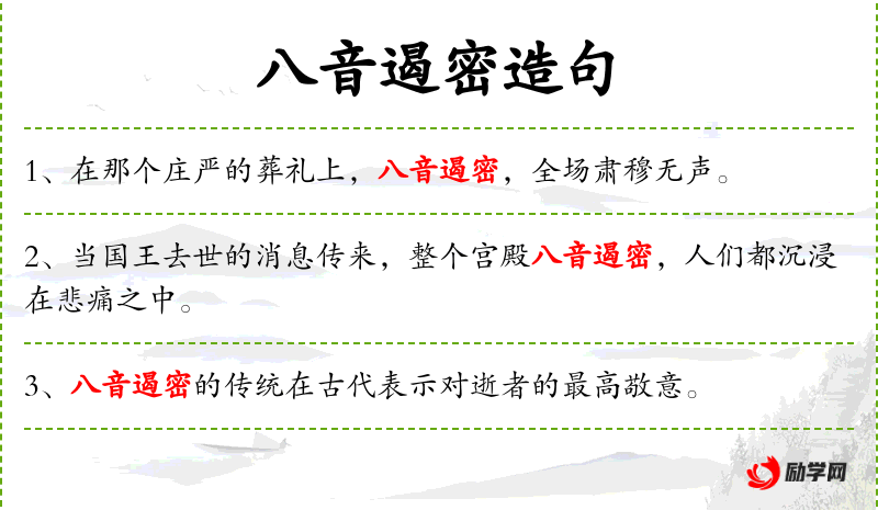 - 成语“八音遏密”源自《尚书·洪范》,原意是指音乐停止,这里用来形容葬礼上的静默。