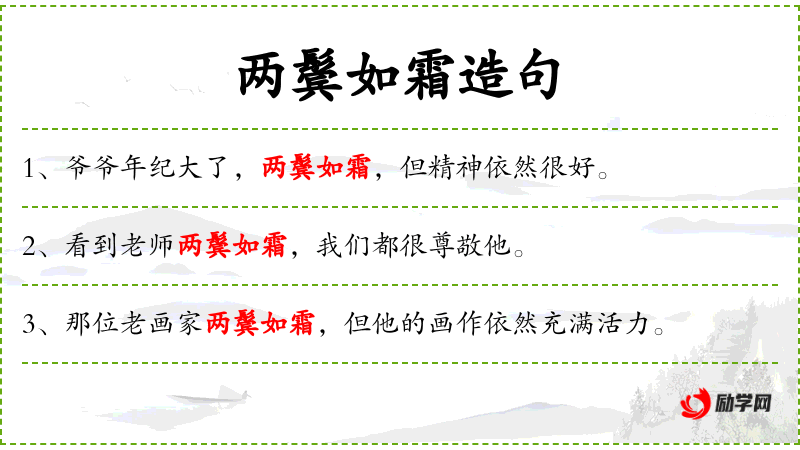 “两鬓如霜”这个表达在**文化中常用来形容老年人,与“白发苍苍”等表达相似。这些词汇都蕴含了对老年人的尊重和敬爱。