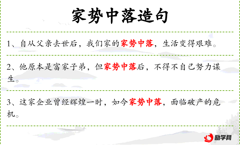 - 中落:动词,指家庭地位或财富的下降。
