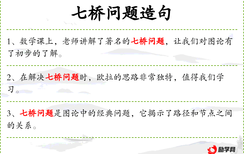 1. 【七桥问题】 著名古典数学问题之一。在哥尼斯堡的一个公园里,有七座桥将普雷格尔河中两个岛及岛与河岸连接起来(如图)。问是否可能从这四块陆地中任一块出发,恰好通过每座桥一次,再回到起点?欧勒于1736年研究并解决了此问题,他把问题归结为如下右图的一笔画”问题,证明上述走法是不可能的。