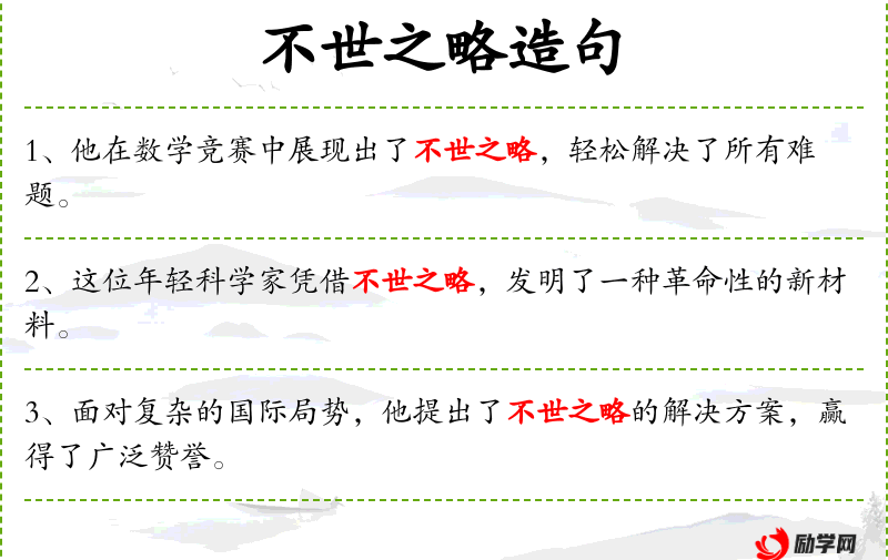 “不世之略”是一个成语,意指非常出色、前所未有的策略或方法。这个成语体现了**文化中对智慧和策略的高度评价。