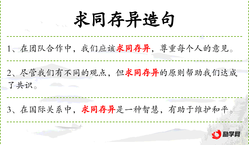 5. 【求同存异】 求:寻求;存:保留;异:不同的。找出共同点,保留不同意见。