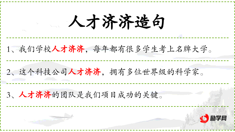 1. 【人才济济】 济济:众多的样子。形容有才能的人很多。
