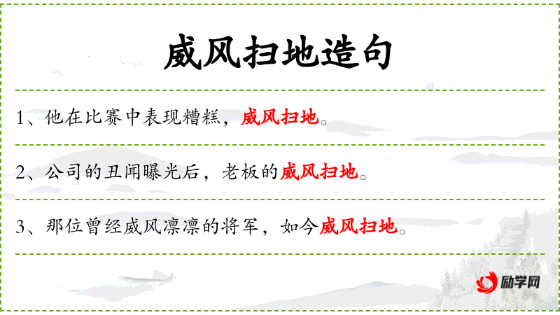1. 【威风扫地】 完全丧失了威严和信誉。