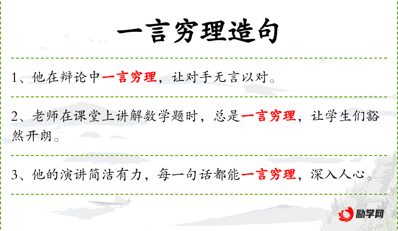 - 一言穷理:成语,表示用简短的话就能把道理讲清楚。