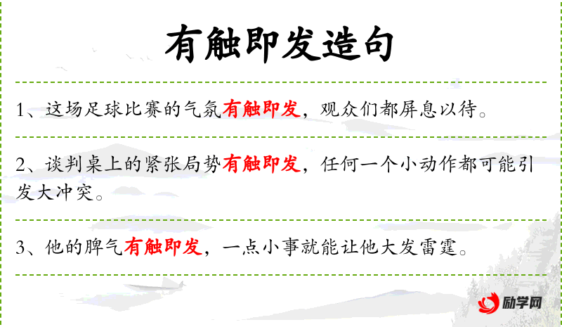 7. 【有触即发】 触:碰;即:就。原指把箭扣在弦上,拉开弓等着射出去。比喻事态发展到了十分紧张的阶段,稍一触动就立即会爆发。
