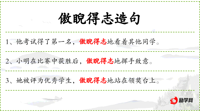 句子:“[他在演讲比赛中获胜,傲睨得志地发表感言。]”
