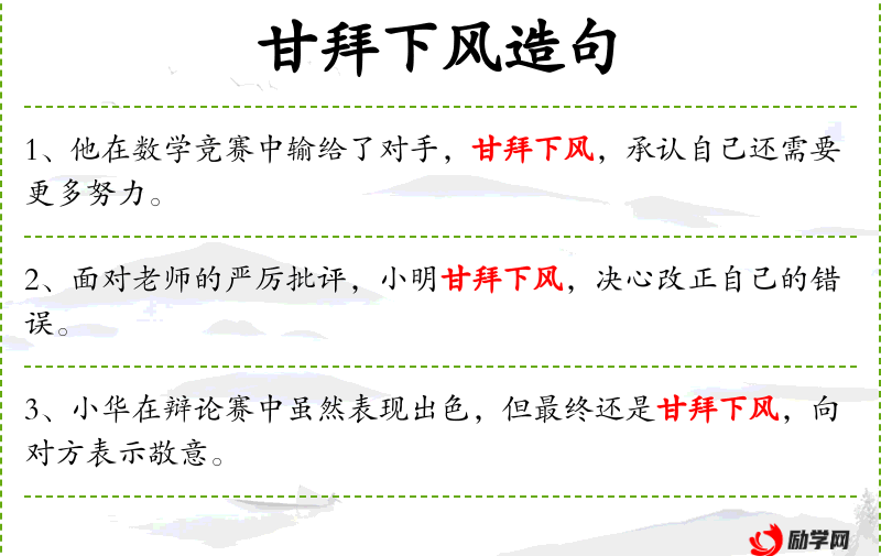 6. 【甘拜下风】 表示真心佩服,自认不如。