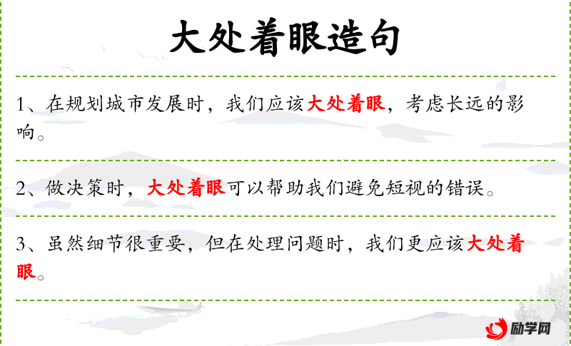 - 大处着眼:从宏观或整体的角度考虑问题。