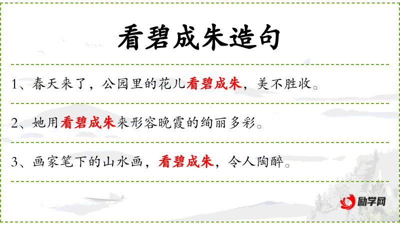 3. 【看碧成朱】 - 碧:翠绿色;朱:大红色。将绿的看成红的。形容眼睛发花,视觉模糊。