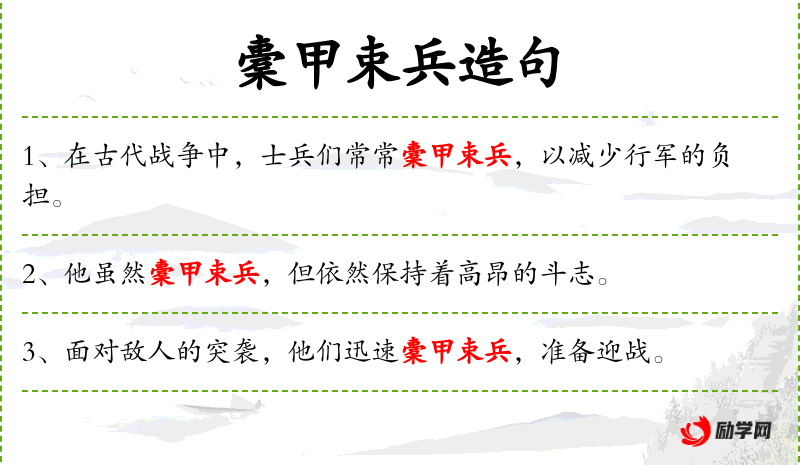 1. 【橐甲束兵】 - 指脱去铠甲,收起兵器。同“櫜甲束兵”。