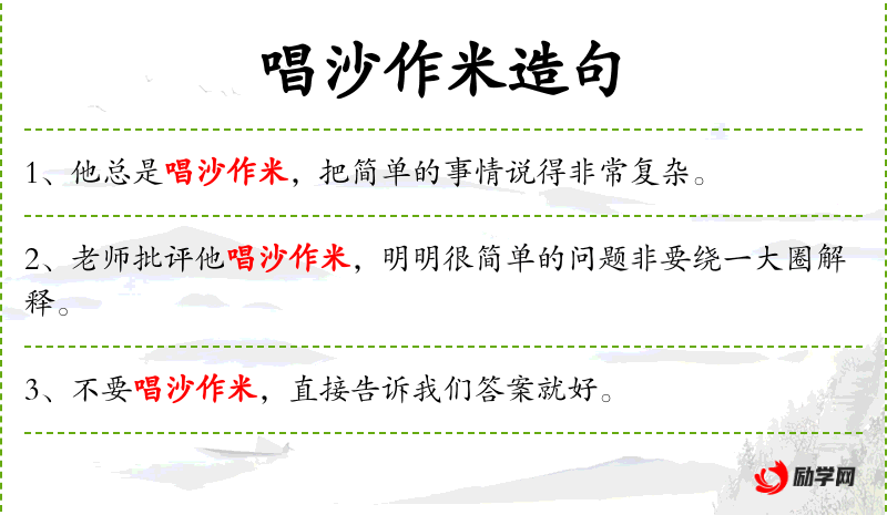 - 唱沙作米:这是一个成语,原意是指把沙子当作米来唱,比喻说话或做事不切实际,空洞无物。