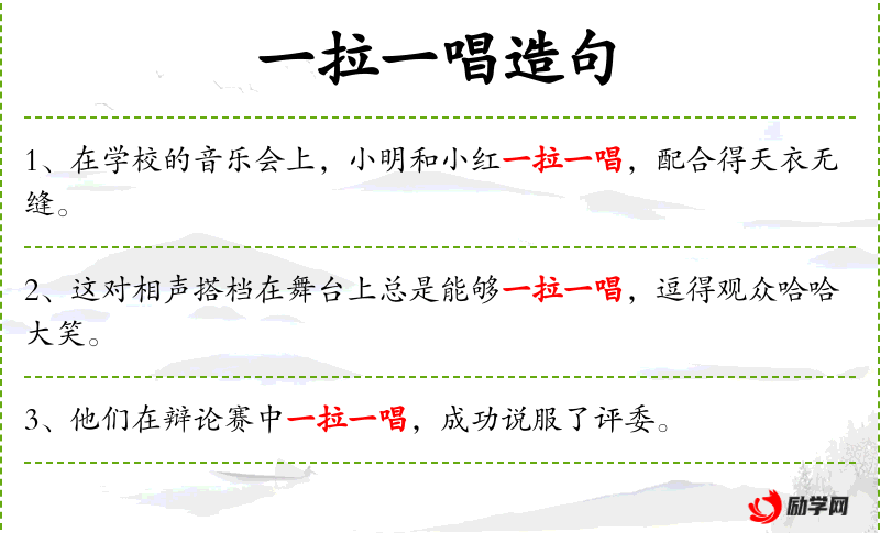 1. 【一拉一唱】 - 唱:唱和。一个人拉琴,另一个人唱和。比喻两人互相配合,一个下面说话,另一个在旁帮腔。