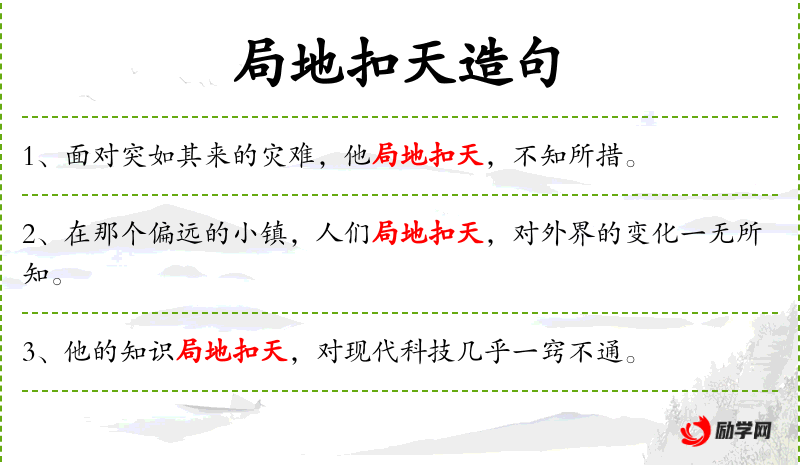 - 局地扣天:这是一个比喻,意思是视野非常狭窄,只能看到很小的一部分。