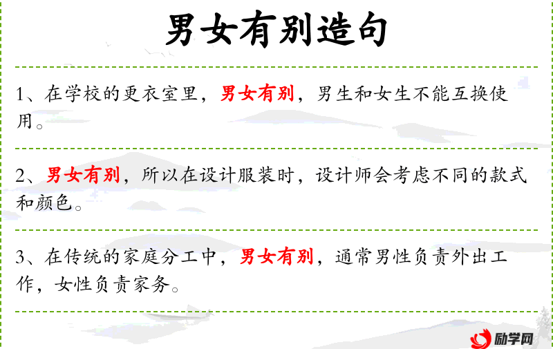 5. 【男女有别】 - 男女之间有严格区别。旧时用以强调应严守封建礼教。