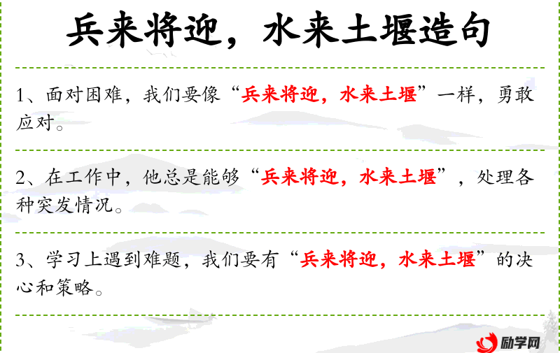 句子:“无论生活中遇到什么挑战,她都能“兵来将迎,水来土堰”,从容应对。”