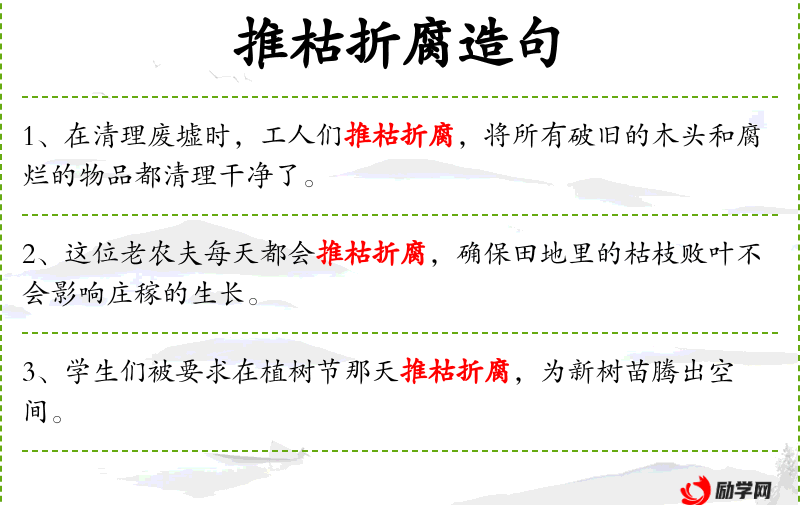 - 相关成语:“推陈出新”,意指去除旧的,创造新的,与“推枯折腐”有相似的含义。