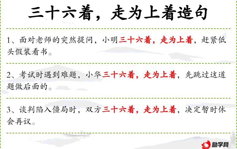“三十六着,走为上着”源自古代的军事策略,现在常用来比喻在复杂情况下采取的最佳策略。这个成语体现了文化中的智慧和策略性思维。