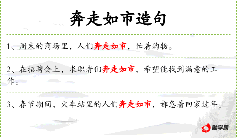 1. 【奔走如市】 走:跑。市:集市。形容为某种目的而奔忙、活动的人很多。