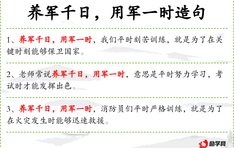 句子:“养军千日,用军一时,教师们平时认真备课,就是为了在教学时能够传授更多知识。”