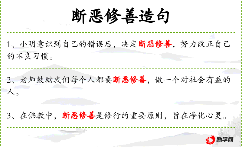 - 断恶修善:成语,意为停止做坏事,开始做好事。