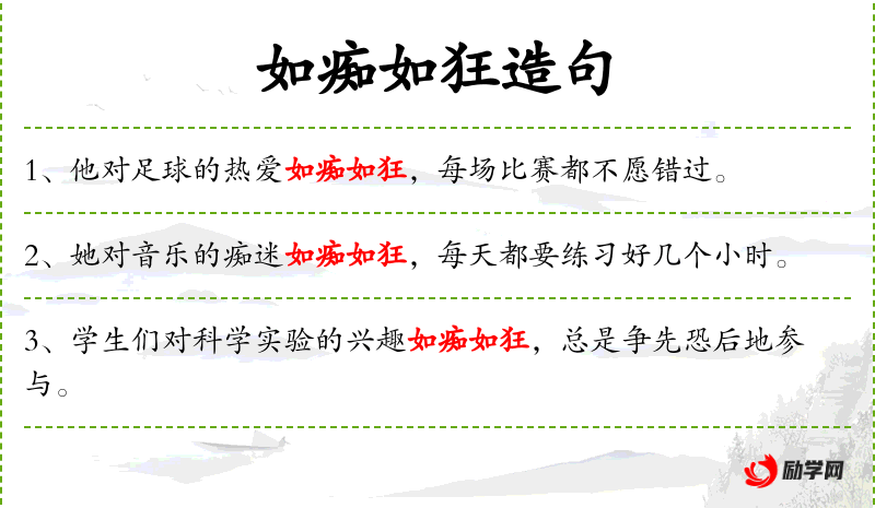 - 如痴如狂:形容非常痴迷或疯狂。相关词汇:狂热、热衷。