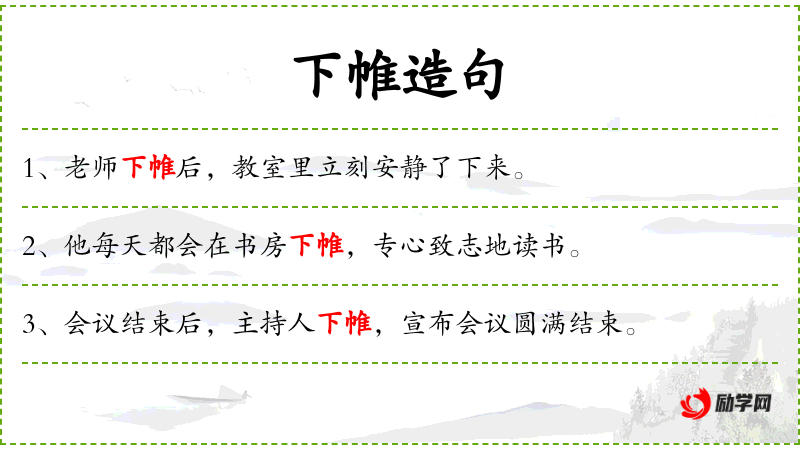 1. 【下帷】 - 放下室内悬挂的帷幕。指教书; 引申指闭门苦读。